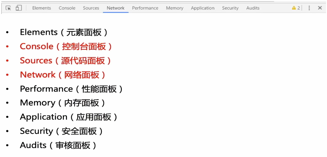 Network(网络面板):从发起网页页面请求Request后得 到的各个请求资源信息(包括状态资源类型、大小、所用时间等),并可以根据这个进行网络性能优化。