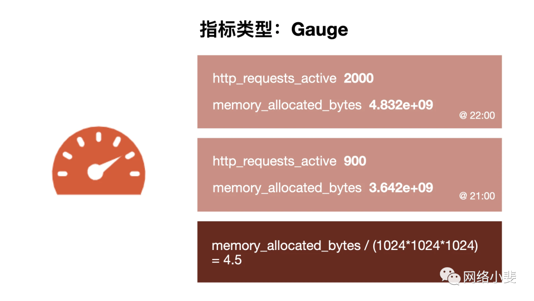 与 Counter 不同, Gauge (可增可减的仪表盘)类型的指标侧重于反应系统的当前状态,因此这类指标的样本数据可增可减。常见指标如 node_memory_MemFree_bytes (当前主机空闲的内存大小)、 node_memory_MemAvailable_bytes (可用内存大小)都是 Gauge 类型的监控指标。由于 Gauge 指标仍然带有时间戳存储,所有我们可以看到随时间变化的值,通常可以直接把它们绘制出来,这样就可以看到值本身而不是变化率了,通过 Gauge 指标,用户可以直接查看系统的当前状态。