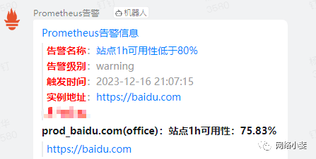 然后, Prometheus 可以通过一个名为 Alertmanager 的组件来发送报警通知,可以配置一些接收器来接收这些报警,比如用钉钉来接收报警: