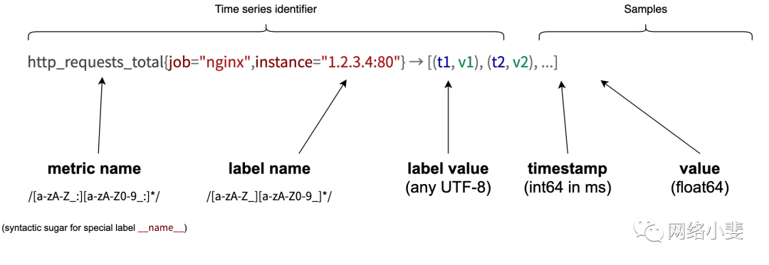 metric):指标名和描述当前样本特征的标签集合timestamp):一个精确到毫秒的时间戳value):一个 float64 的浮点型数据表示当前样本的值如下所示: