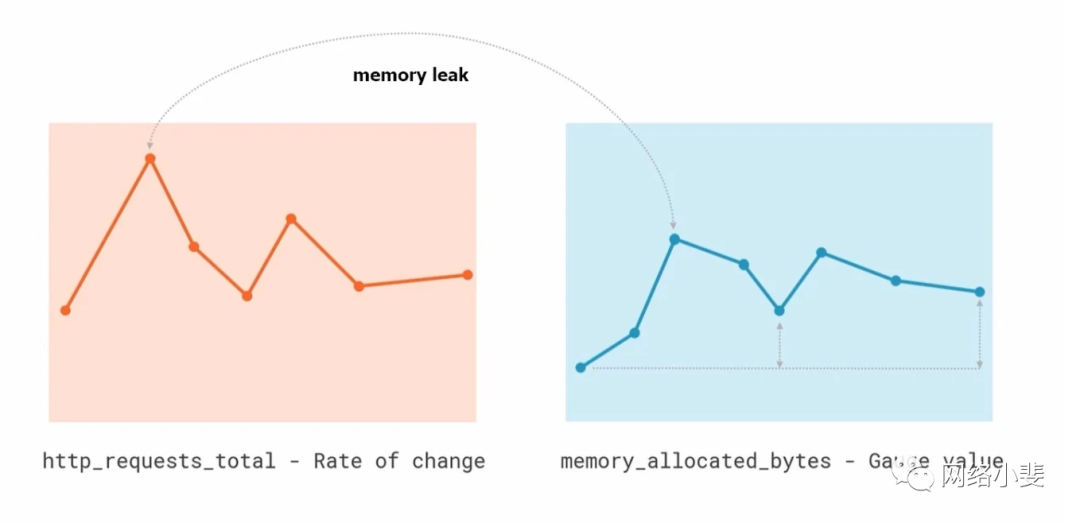 这些简单的指标类型都只是为每个样本获取一个数字,但 Prometheus 的强大之处在于如何让你跟踪它们,比如我们绘制了两张图,一个是 HTTP 请求的变化率,另一个是分配的 Gauge 类型的实际内存,直接从图上就可以看出这两个之间有一种关联性,当请求出现峰值的时候,内存的使用也会出现峰值,但是我们仔细观察也会发现在峰值过后,内存使用量并没有恢复到峰值前的水平,整体上它在逐渐增加,这表明很可能应用程序中存在内存泄露的问题,通过这些简单的指标就可以帮助我们找到这些可能存在的问题。