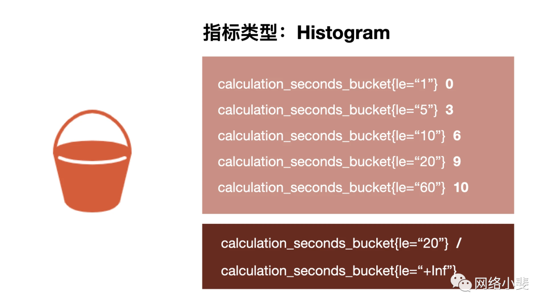 <basename>_bucket{le="<数值区间的上边界>"}<basename>_sum<basename>_count (与上述 <basename>_bucket{le="+Inf"} 相同)尽管 Summary 非常有用,但是平均值会隐藏一些细节,上图中10与113的总和包含非常广的范围,如果我们想查看时间花在什么地方了,那么我们就需要直方图了。直方图以 bucket 桶的形式记录数据,所以我们可能有一个桶用于需要1s或更少的计算,另一个桶用于5s或更少、10s或更少、20s或更少、60s或更少。该指标返回每个存储桶的计数,其中3个在5s或更短的时间内完成,6个在10s或更短的时间内完成。 Prometheus 中的直方图是累积的,因此所有10次计算都属于60s或更少的时间段,而在这10次中,有9次的处理时间为20s或更少,这显示了数据的分布。所以可以看到我们的大部分计算都在10s以下,只有一个超过20s,这对于计算百分位数很有用。如下所示:
