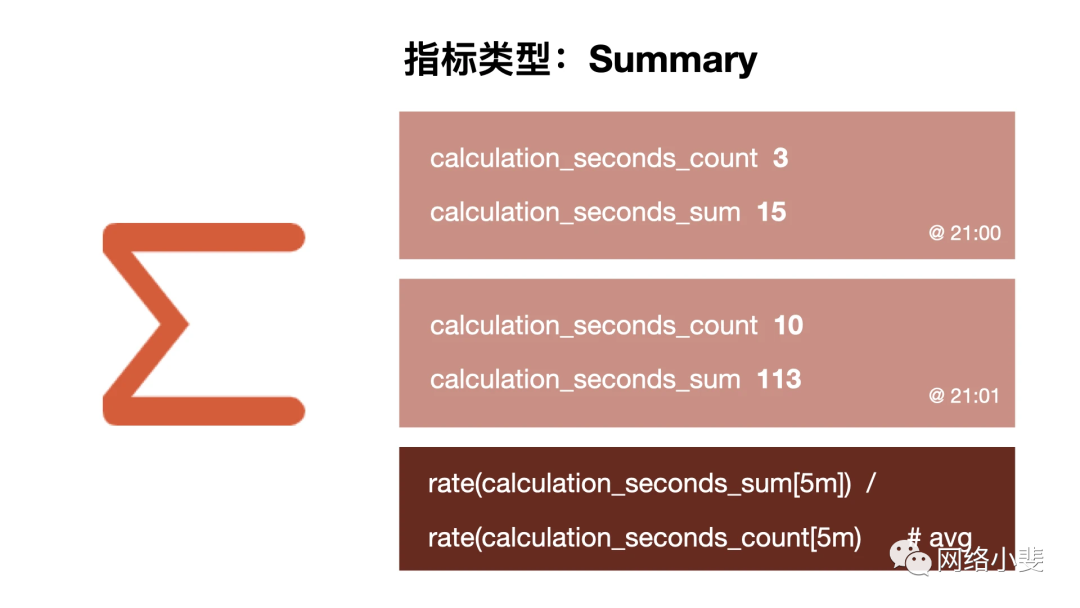 Summary 用于记录某些东西的 平均大小 ,可能是计算所需的时间或处理的文件大小, Summary 显示两个相关的信息: count(事件发生的次数)和 sum(所有事件的总大小),如下图计算 Summary 指标可以返回次数为3和总和15,也就意味着3次计算总共需要15s来处理,平均每次计算需要花费5s。下一个样本的次数为10,总和为113,那么平均值为11.3,因为两组指标都记录有时间戳,所以我们可以使用 Summary 来构建一个图表,显示平均值的变化率,比如图上的语句表示的是5分钟时间段内的平均速率。