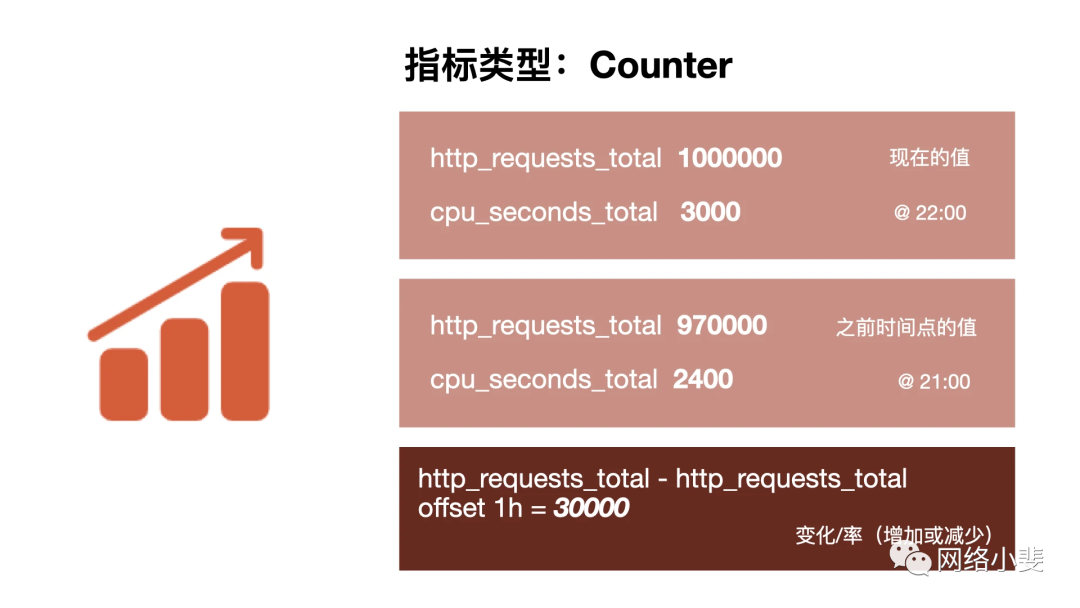 从存储上来讲所有的监控指标都是相同的,但是在不同的场景下这些指标又有一些细微的差异。 例如,在 Node Exporter 返回的样本中指标 node_load1 反应的是当前系统的负载状态,随着时间的变化这个指标返回的样本数据是在不断变化的。而指标 node_cpu_seconds_total 所获取到的样本数据却不同,它是一个持续增大的值,因为其反应的是 CPU 的累计使用时间,从理论上讲只要系统不关机,这个值是会一直变大。