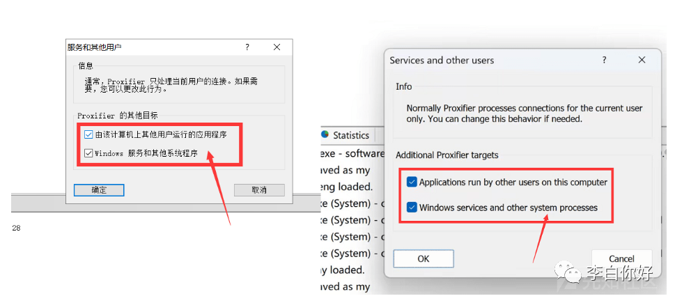 在“配置文件”的“高级”处,选择“服务与其他用户”,然后勾选上两个选项: