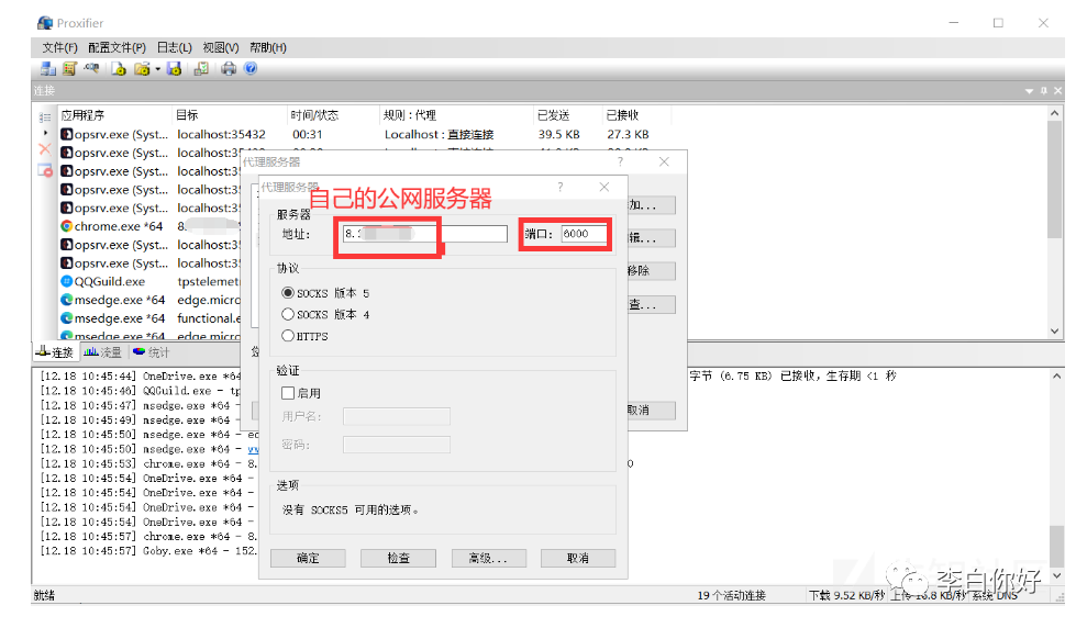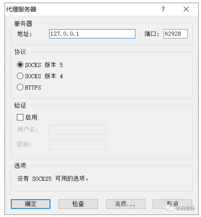 找到代理的服务端的IP和端口(本地代理服务就是 127.0.0.1)并填写和选择对应代理协议,如下图所示: