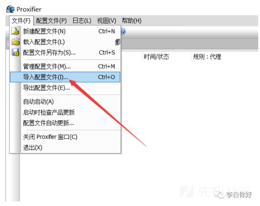 然后点击 Proxifier 左上角的“文件”-->“导入配置文件”,选择解压出的 Default.ppx 文件即可导入成功