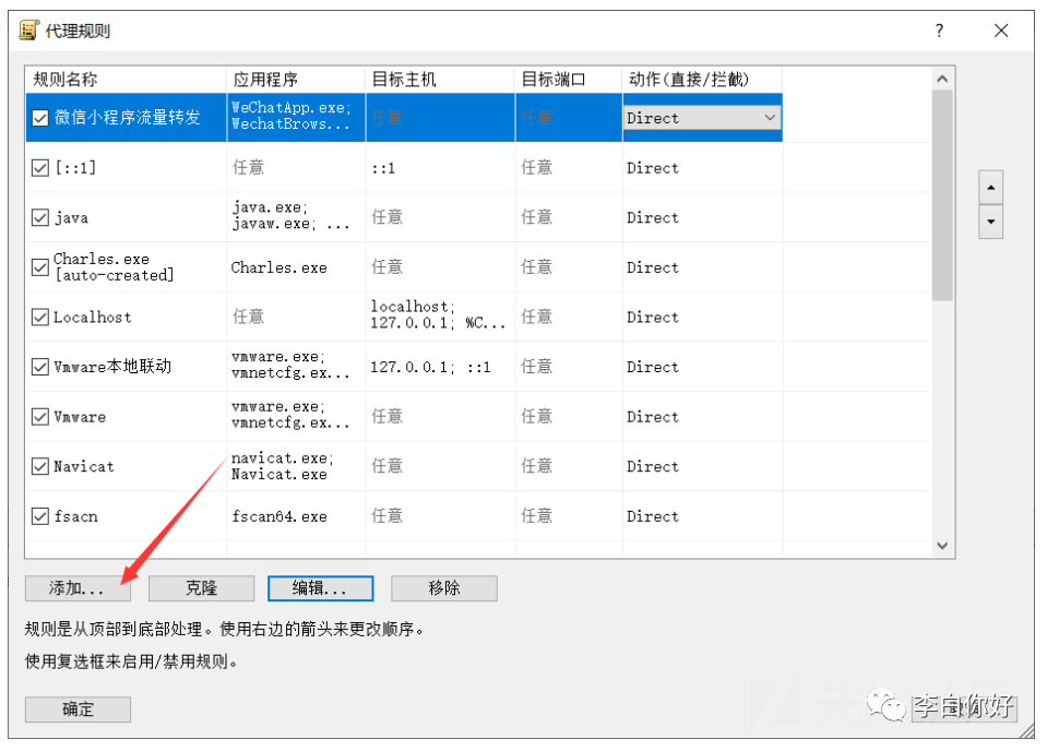 打开“代理规则”列表,点击“添加”按钮