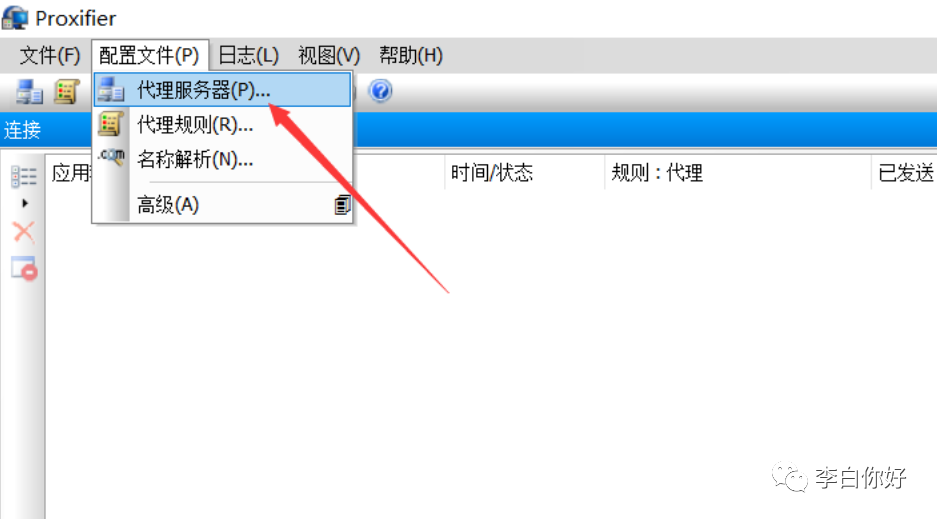 打开安装好的 Proxifier ,点击菜单栏“配置文件”中的“代理服务器”
