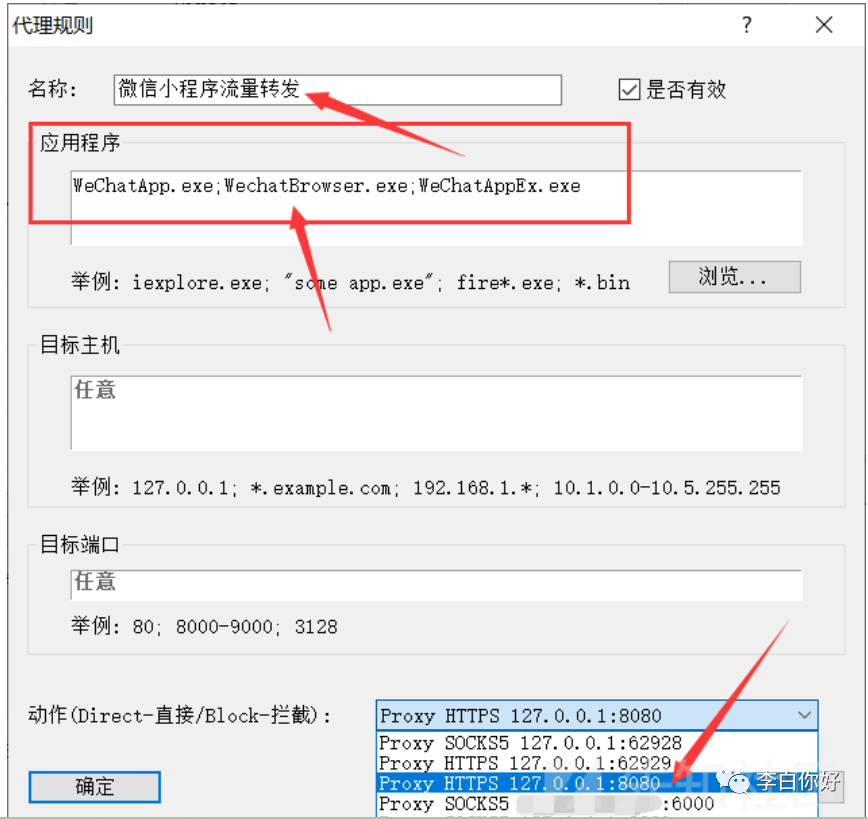 WeChatApp.exe;WechatBrowser.exe;WeChatAppEx.exe这里的代理服务器我使用的是 HTTPS://127.0.0.1:8080 这个要看你抓包软件中的配置了,如下: