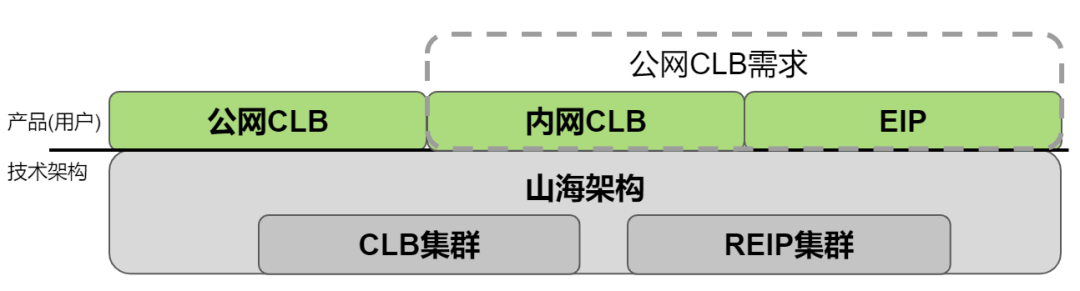借助这个两级架构模型,我们能够把公网CLB保留下来,并且通过REIP把公网入口收敛。进一步思考并完善,我们提出了下面的想法:跟产品进行解耦。以前我们一个地区上线公网CLB产品,底层就要搭建有一个公网CLB的集群去支持。用户需要内网CLB服务,就要对应搭建个内网CLB的集群。底层集群类型跟产品是强耦合,有IPv4/IPv6, 公网/内网、BGP/三网组合出的多个产品形态。这种模式在小地域部署,因为产品业务的流量小,集群利用率低,就会造成很大的成本压力。为了应对这种小带宽低成本的诉求,我们将CLB+REIP的模型进一步抽象,引入山海架构:我们只建设CLB和REIP两类集群。通过这两类集群上的不同实例组合,满足多个产品形态的要求。从而实现产品形态和底层物理网络集群类型解耦。