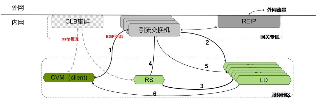 我们把原来CLB集群对外声明路由的能力放到了引流交换机上,把CLB服务器用用通用服务器区的设备来代替。考虑收敛比和容灾,不会把一个集群放到一两个机架上,会相对分散些,更不会把整个机架全部再用成CLB集群。这样CLB集群不再单独建设网关专区,引流交换机把路由声明发出去,通过隧道跟CLB设备转发流量。