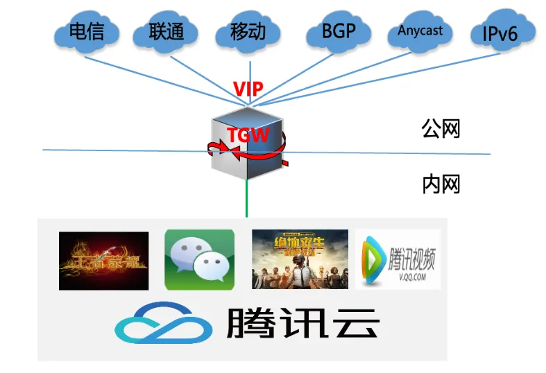 TGW全称Tencent Gateway,是一套实现多网统一接入,支持自动负载均衡的系统, 是公司有10+年历史的网关,因此TGW也被称为公司公网的桥头堡。它对外连接了各大运营商并支撑公有云上EIP、CLB等产品功能,对内提供了公网网络的接入功能,如为游戏、微信等业务提供公网接入服务。