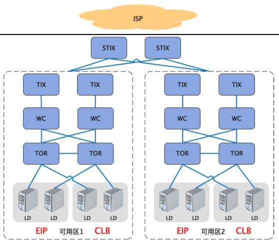 这个架构模型也有一定的局限性的。公网CLB实例只能承载公网的流量,无法像上文提到的两层RERP+CLB那样,内外网随时进行转化。REIP+CLB实例中的CLB既承载内网侧CLB的流量,又承载公网侧CLB的流量。