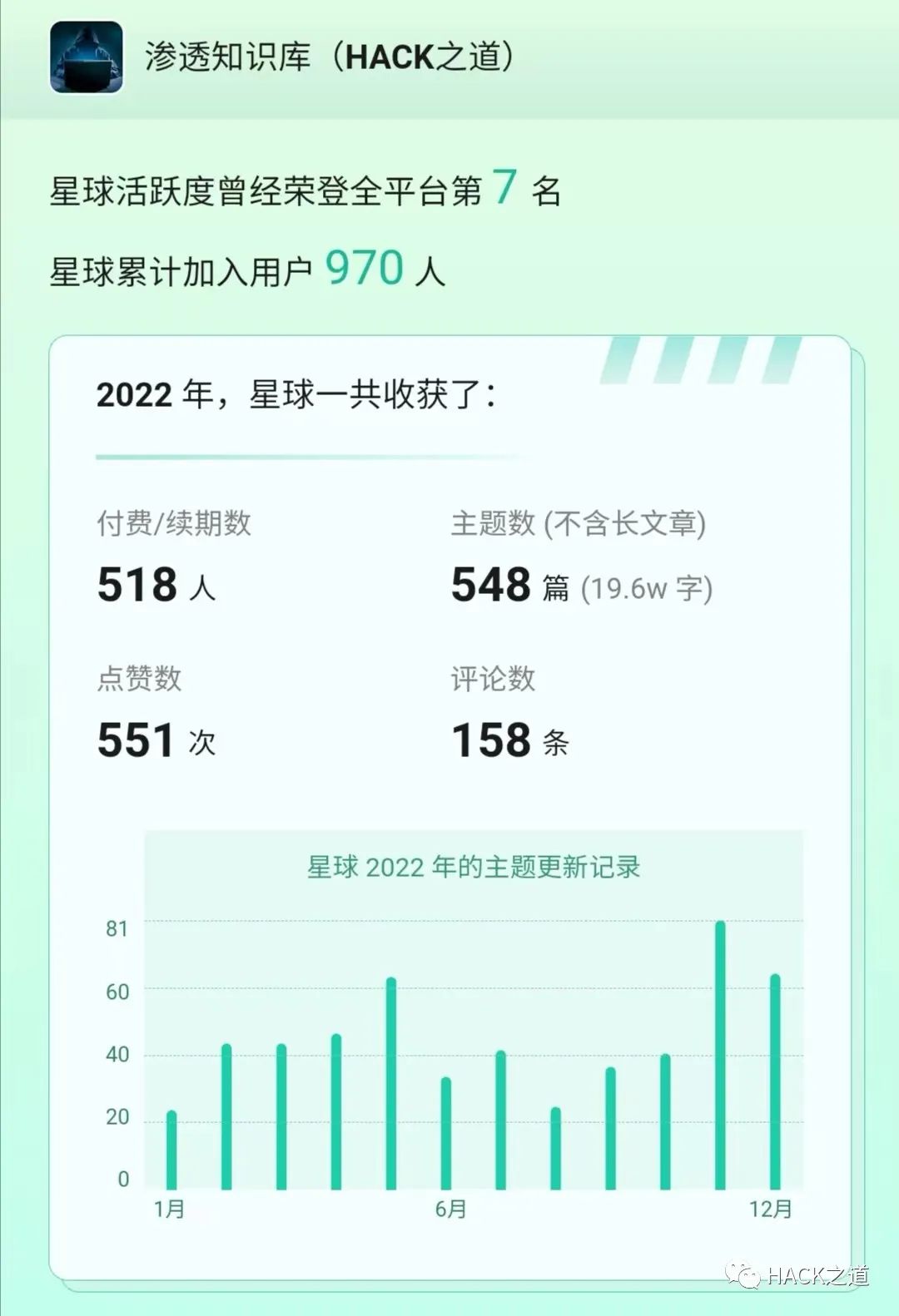 知识星球渗透知识库2022年成绩已持续运营3年多,欢迎师傅们加入分享各种干货资源知识星球渗透知识库(HACK之道)汇集最全、最新的安全知识库,内容不限于红队攻防实战、内网渗透、代码审计、社工、安卓逆向
