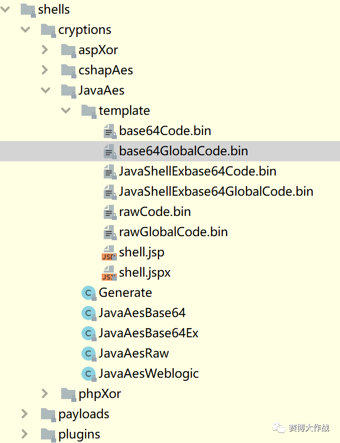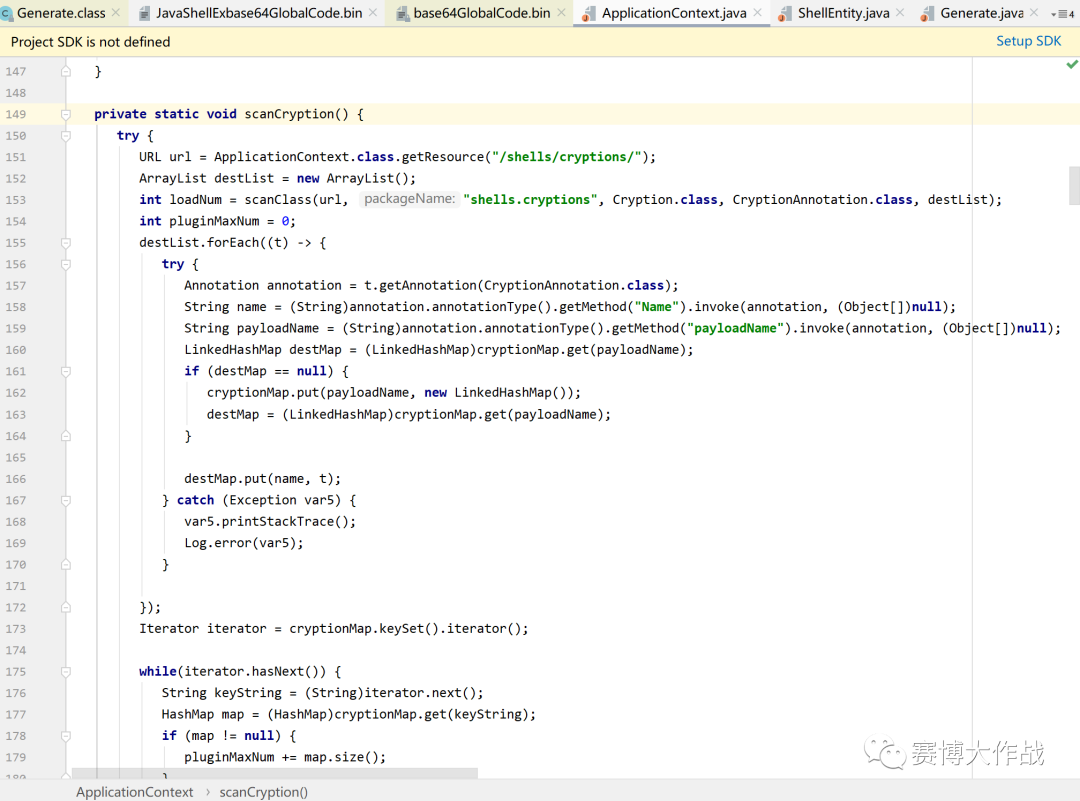 // 1 core.ApplicationContext.scanCryption方法 代码如下private static void scanCryption() {try {// 扫描/shells/cryptions/路径下的所有加密器类URL url = ApplicationContext.class.getResource("/shells/cryptions/");ArrayList destList = new ArrayList();int loadNum = scanClass(url, "shells.cryptions", Cryption.class, CryptionAnnotation.class, destList);int pluginMaxNum = 0;// 加密器名与加密器类关联,如:JAVA_AES_BASE64加密器名与JavaAesBase64类关联destList.forEach((t) -> {try {Annotation annotation = t.getAnnotation(CryptionAnnotation.class);String name = (String)annotation.annotationType().getMethod("Name").invoke(annotation, (Object[])null);String payloadName = (String)annotation.annotationType().getMethod("payloadName").invoke(annotation, (Object[])null);LinkedHashMap destMap = (LinkedHashMap)cryptionMap.get(payloadName);if (destMap == null) {cryptionMap.put(payloadName, new LinkedHashMap());destMap = (LinkedHashMap)cryptionMap.get(payloadName);}destMap.put(name, t);} catch (Exception var5) {var5.printStackTrace();Log.error(var5);}});Iterator iterator = cryptionMap.keySet().iterator();while(iterator.hasNext()) {String keyString = (String)iterator.next();HashMap map = (HashMap)cryptionMap.get(keyString);if (map != null) {pluginMaxNum += map.size();}}Log.log(String.format("load cryption success! cryptionMaxNum:%s onceLoadCryptionNum:%s", pluginMaxNum, loadNum));} catch (Exception var7) {Log.error(var7);}}