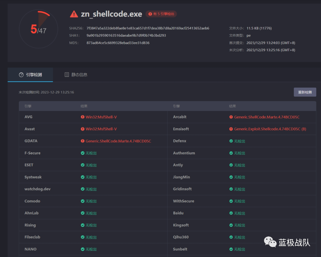再上传到virscan上面去检测一下,很遗憾,有几款杀软还是检测出来了msfshellcode。