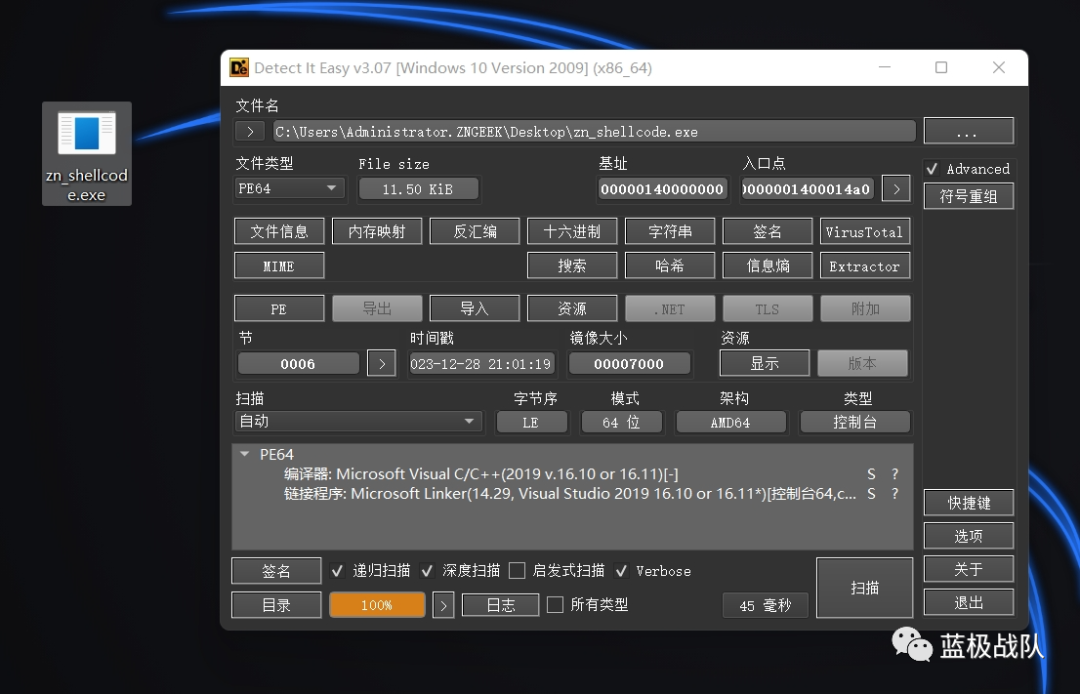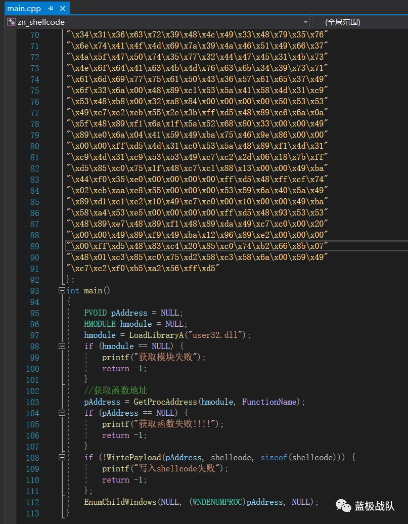 EnumChildWindows(NULL, (WNDENUMPROC)pAddress, NULL);整体思路已经整理清楚,创建一个main.cpp直接编译一个demo来测试一下,shellcode我直接使用msf生成的原生win64的shellcode。