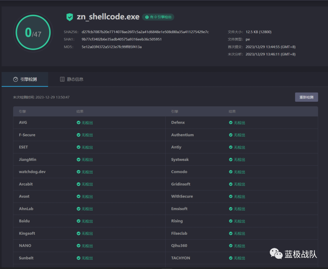 编译后测试免杀及执行shellcode均没问题。继续再上传virscan看看。