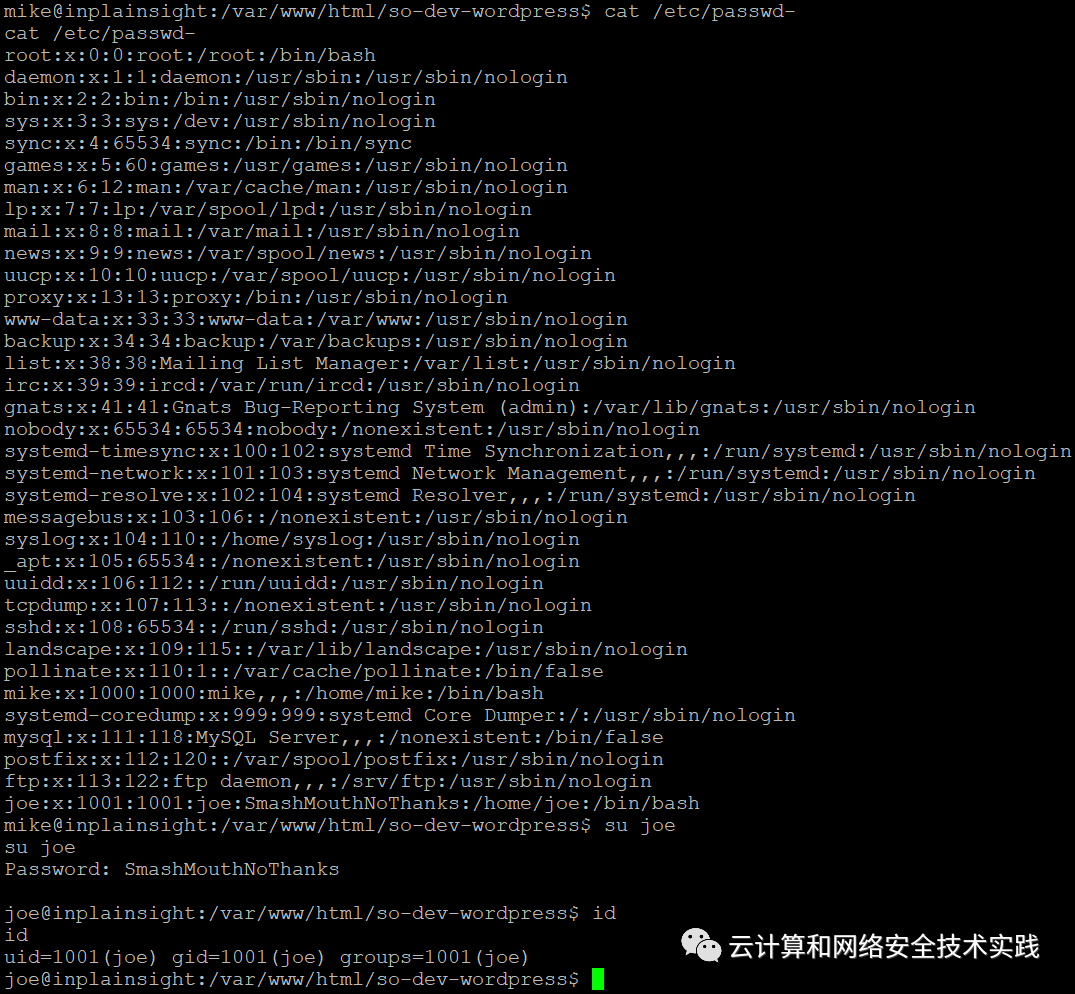 继续查看/etc/passwd-,获取到joe/SmashMouthNoThanks,