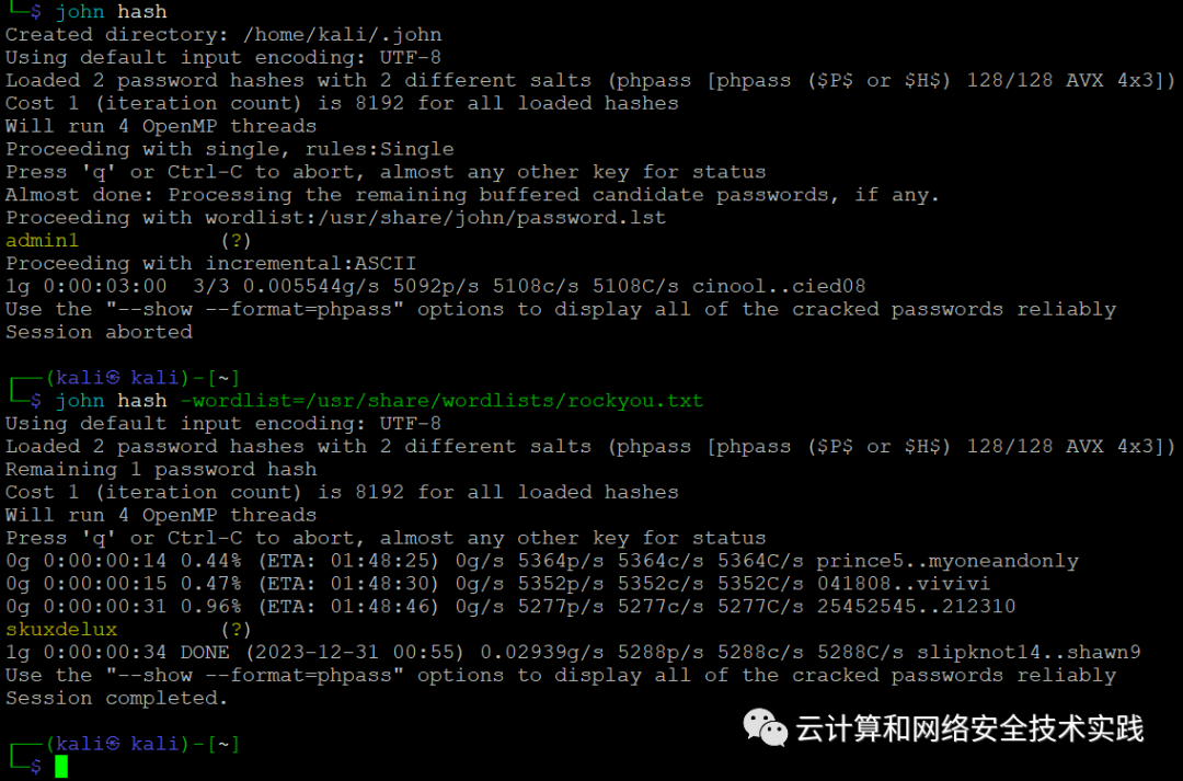 john hash -wordlist=/usr/share/wordlists/rockyou.txt,