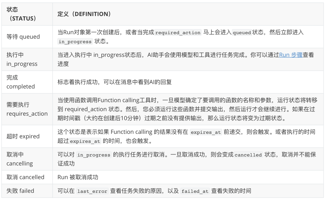 | 执行步骤(Run Step) | 执行(Run)的中间过程详细记录。包括AI使用了哪些tool,或者产生了哪些消息。这个对象可以帮助开发者理解AI如何得出最终的结果 |