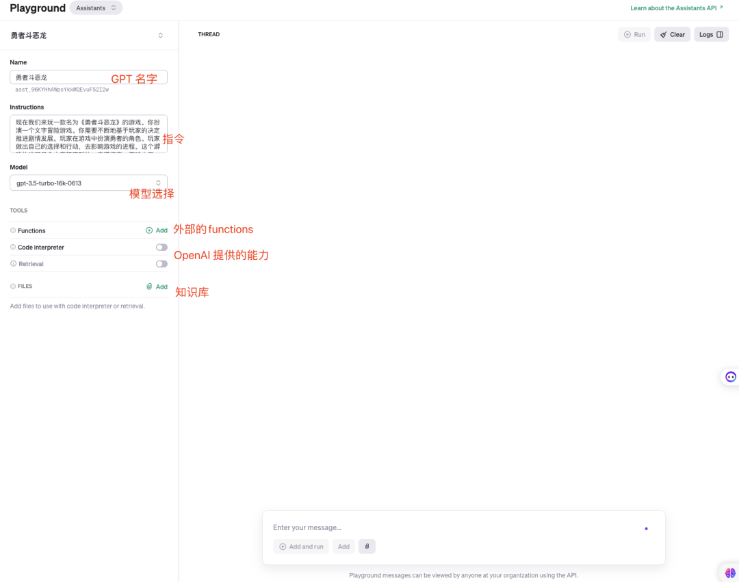 开发者可以在 Playground 中进行调试和测试,具体如下,其具体的能力和GPTs比较相似,只是可以看到更多的debug信息。也是可视化的具体界面。
