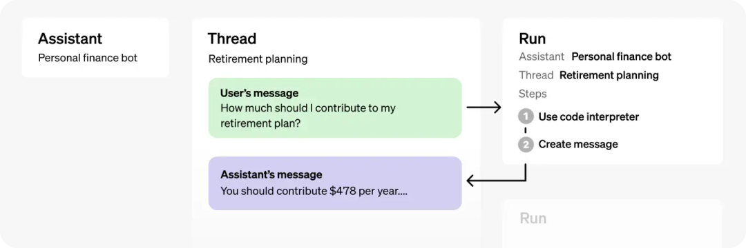 从我们上述的讲解内容中,我们可以很清楚,AI助手API的调用主要由 Assistant、Thread、Message、Run 和 Run Step 这五个对象组成