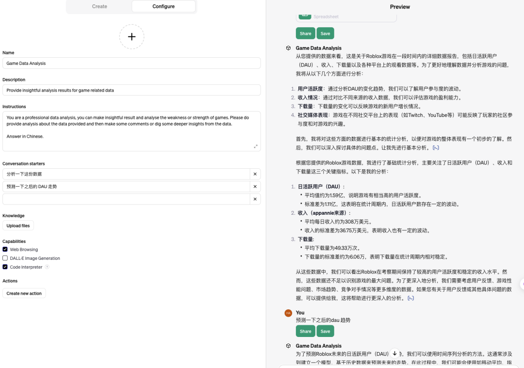 例如下面设置的一个游戏GPTs,我们通过配置,使得GPT可以进行数据分析,并且可以使用