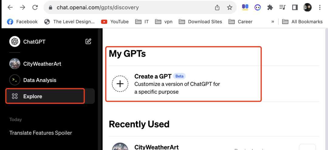 登陆 OpenAI 网站,选择 Explore,然后再 My GPTs 中选择 create a GPTs.