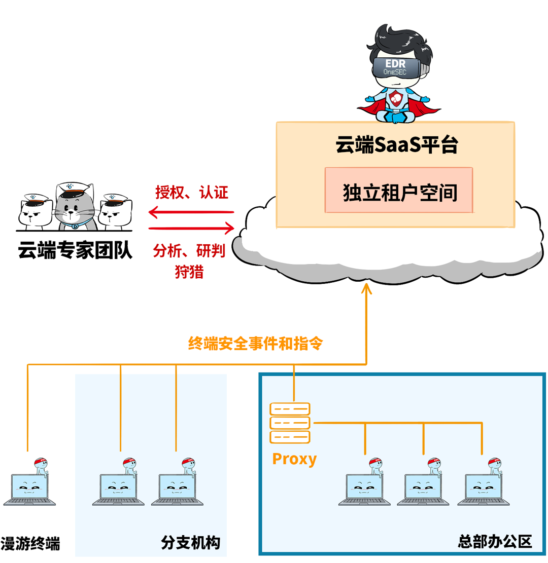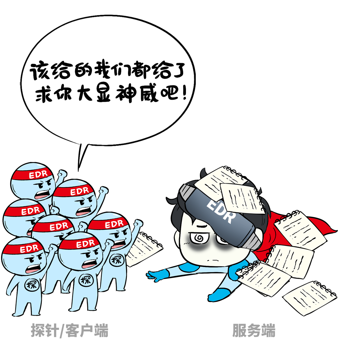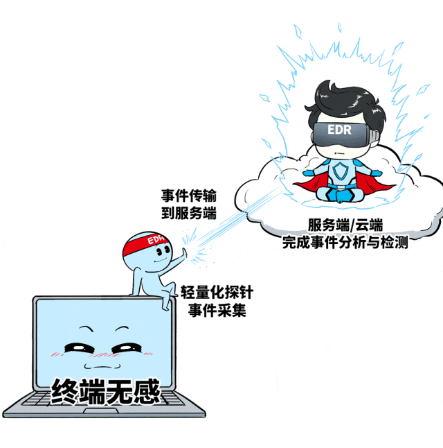 传统终端安全软件的机制,是客户端重载,威胁检测几乎全部在终端侧完成,终端用户的工作经常被打扰,而且系统资源开销很大(尤其杀软、桌管等多套客户端并行状况下)而EDR客户端只负责事件收集,然后将可以事件实时同步到服务器端/云端,通过服务端进行大数据检测、分析、情报匹配,以及专家介入研判处置。