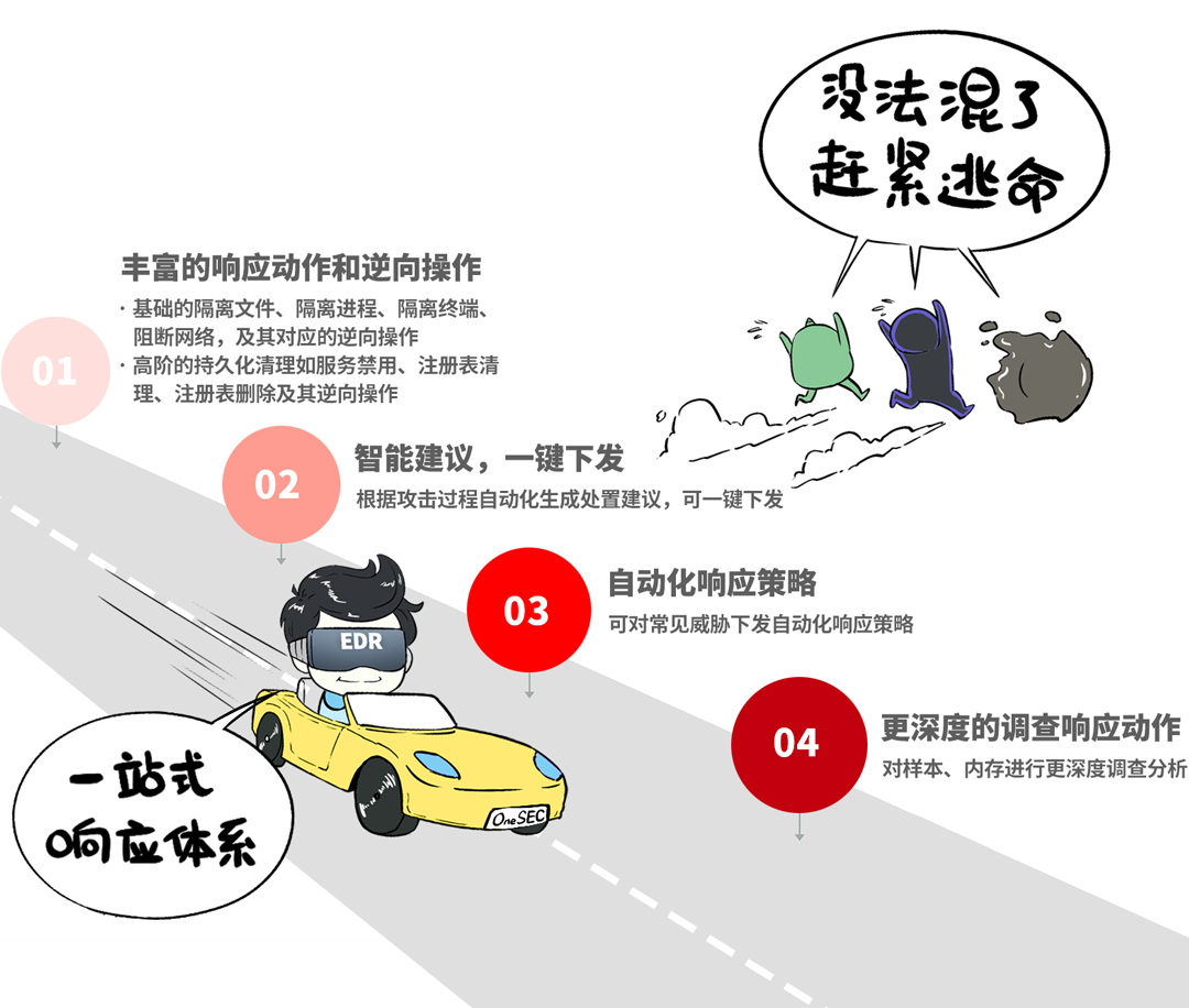 纵使前面万般努力,最后还需“一哆嗦”,这“一哆嗦”就是响应。OneSEC EDR提供序列化、智能化、自动化的响应能力,除恶务尽,还终端清净。![]()