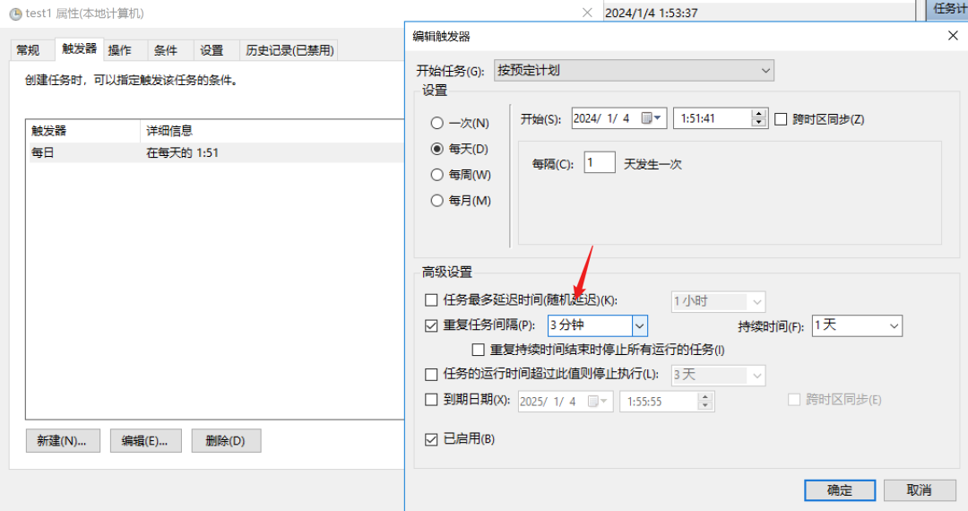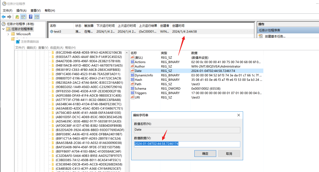 创建两个计划任务,一个修改文件,一个修改注册表,之后观察两个计划任务的执行情况