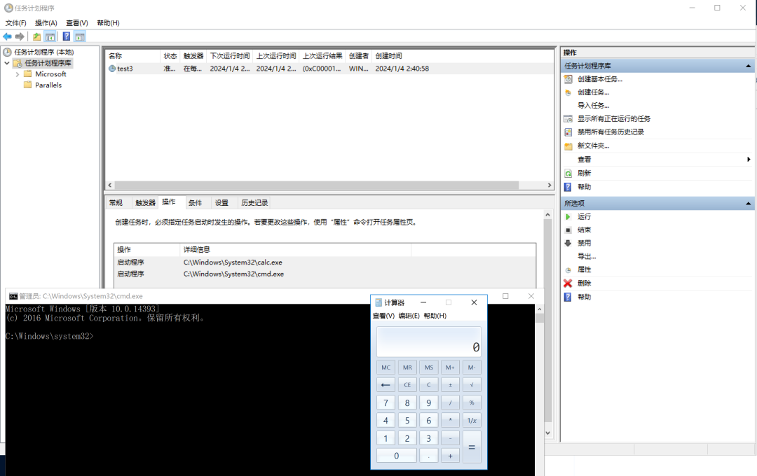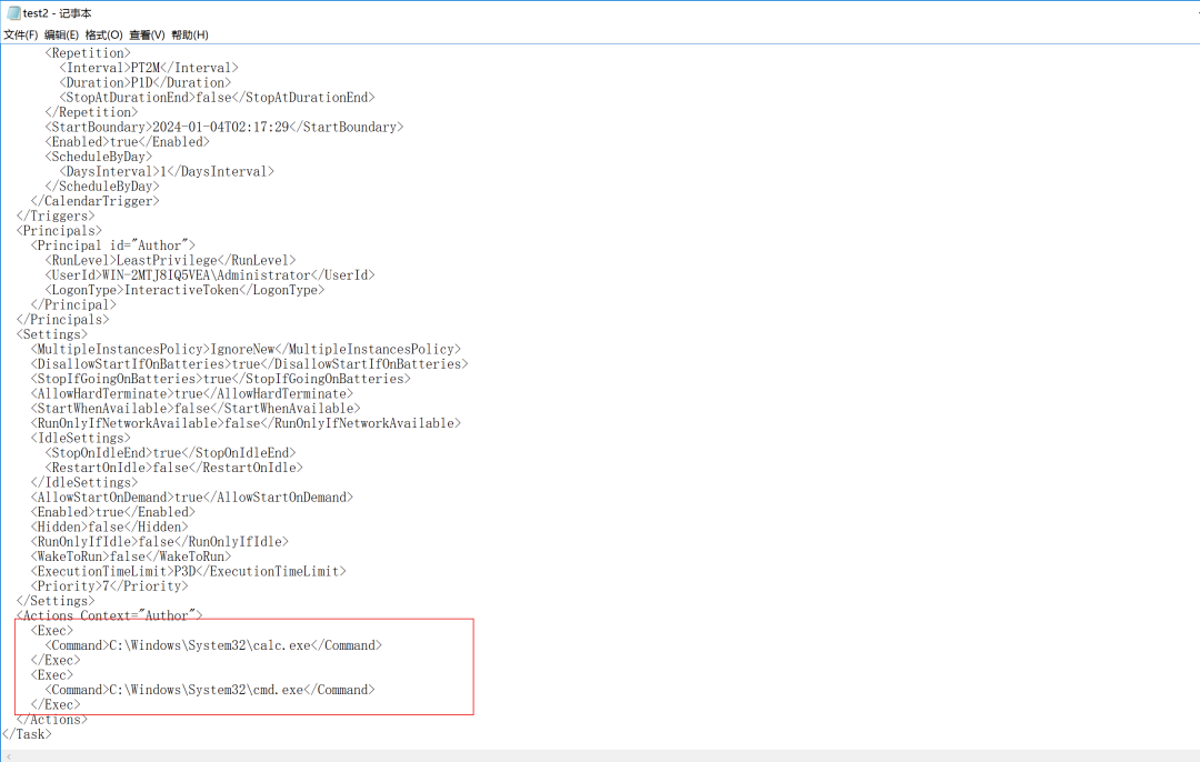 之后的多次执行结果都是计算器和cmd 均执行,计划任务文件没有被更改