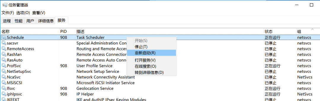 任务管理器中直接重启是不行的,需要通过 SYSTEM 权限打开任务管理器