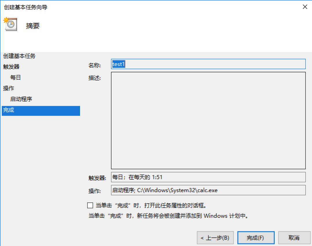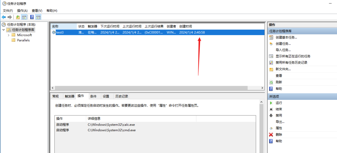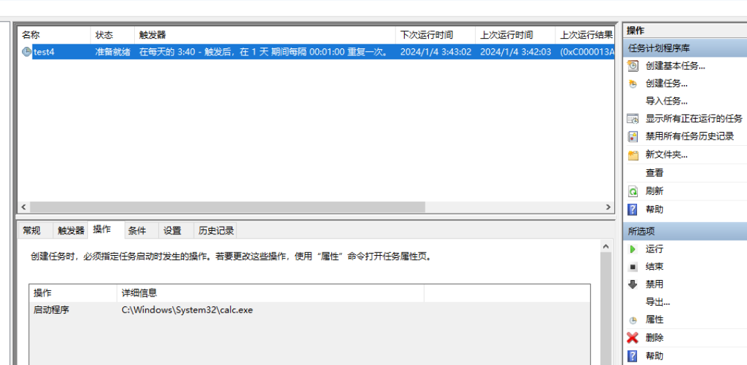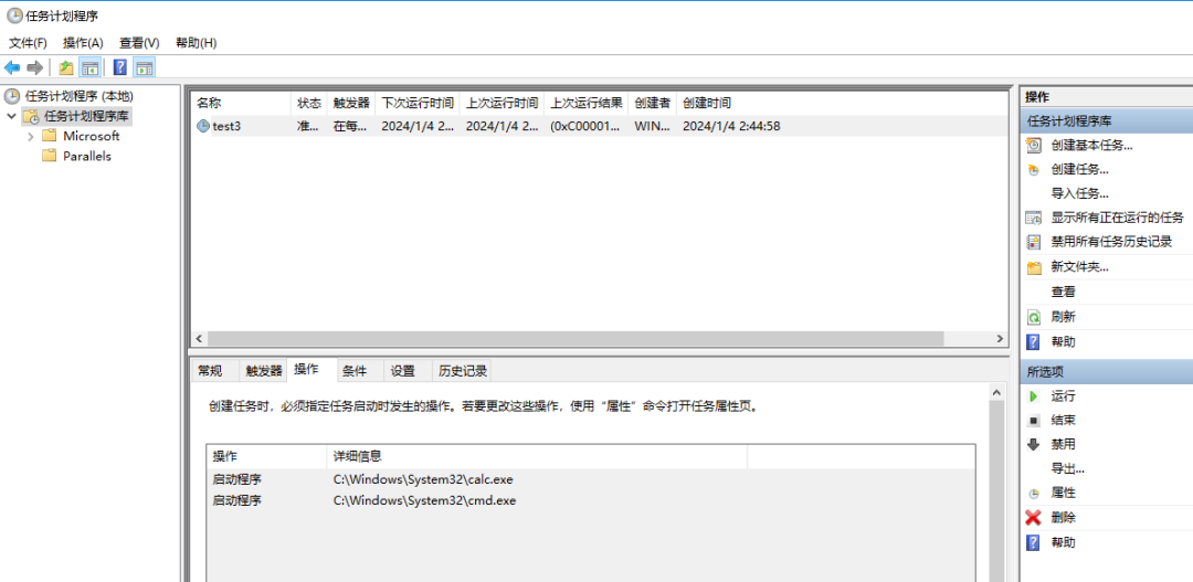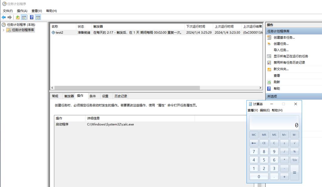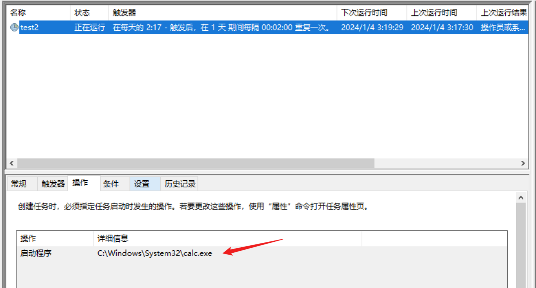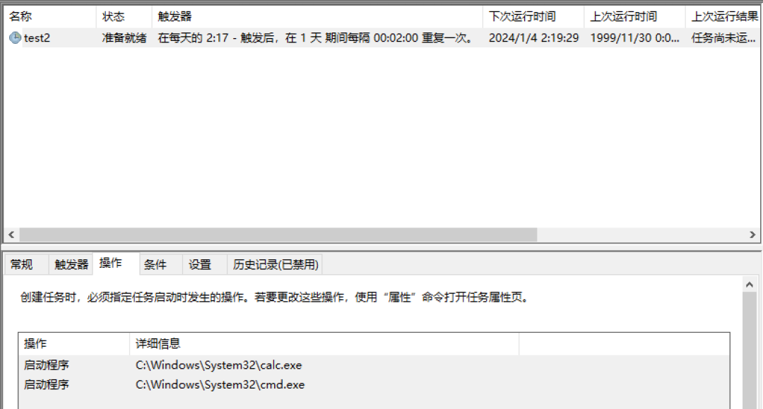 刷新后,计划任务程序中 test2 还在,操作处果然只剩下一个操作了