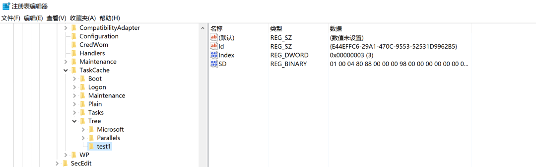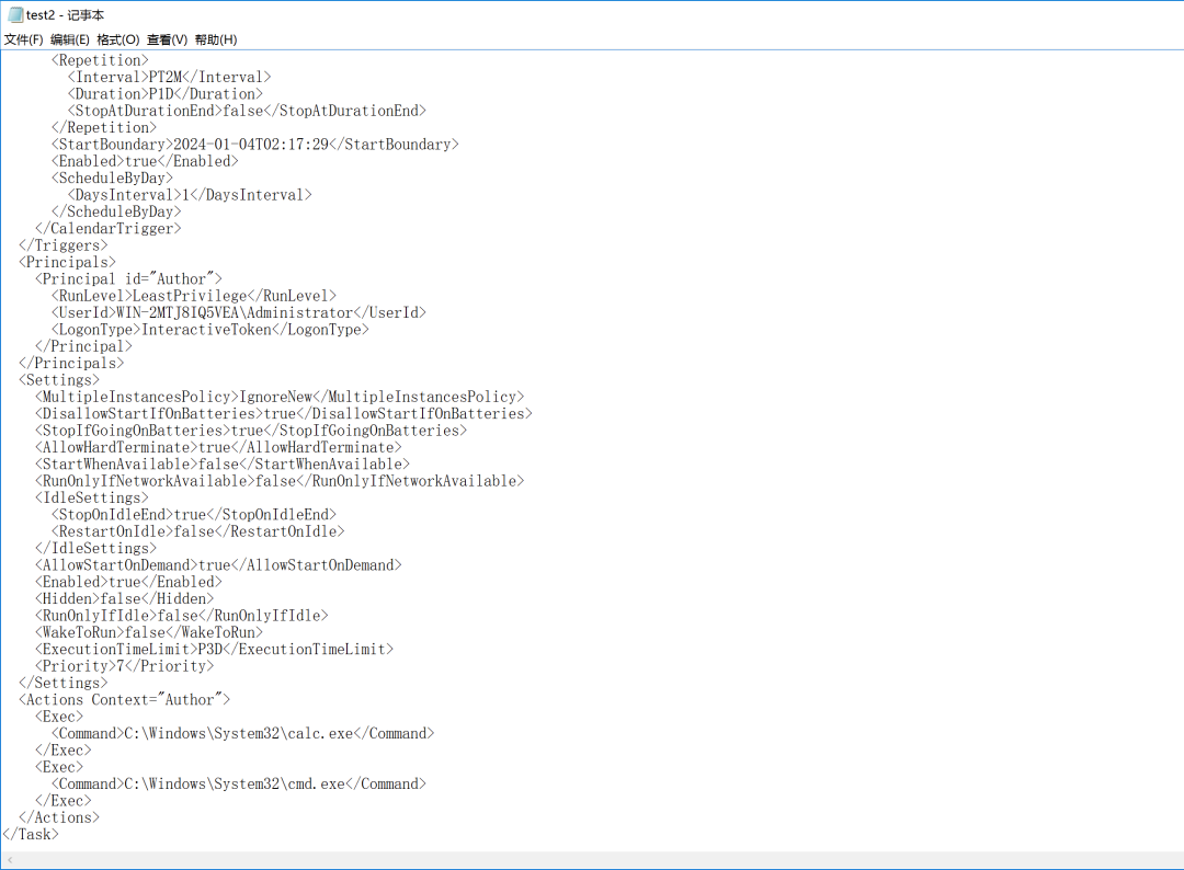 接下来我们通过简单的实验,确定一下到底是计划任务文件还是注册表在决定着计划任务的执行结果,还是相互同步修改的?