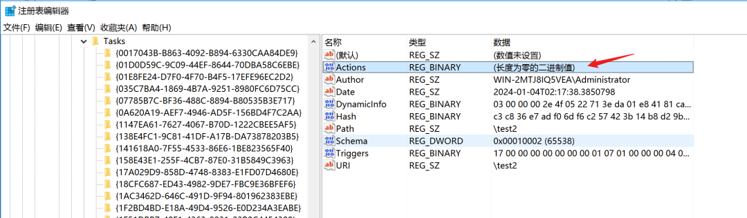 具体修改后,重启计划任务服务后执行直白,可能是因为 HASH 校验吧,也可能是因为我们修改二进制值格式不对,接下来我们来探究