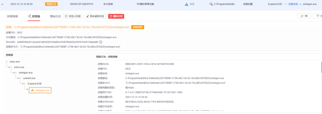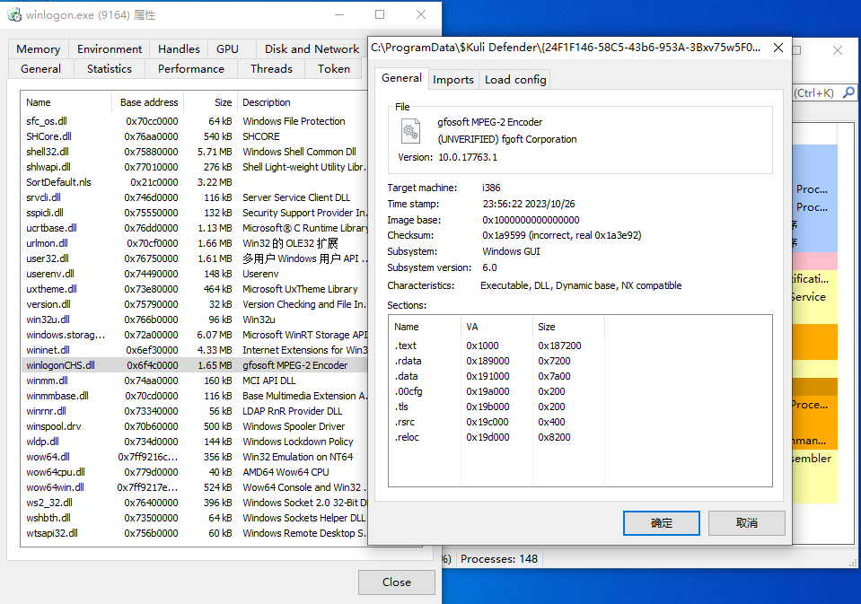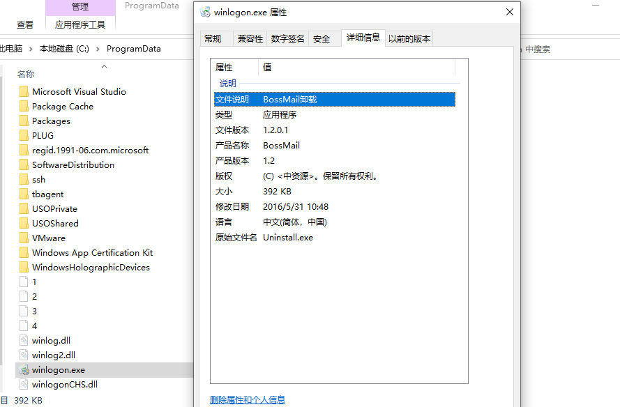 运行MSI文件后会在C:\ProgramData\释放初始文件运行,winlogon.exe程序为BossMail卸载程序,主要是为了使用白利用手法加载恶意dll文件winlogonCHS.dll: