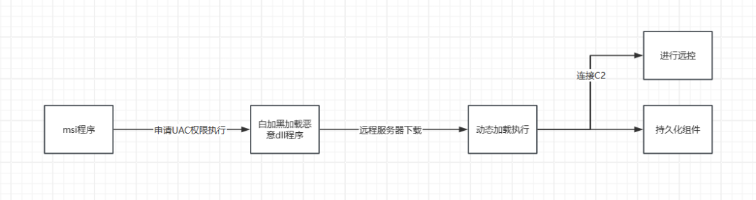 技术特点 | 1.使用MSI安装程序进行载荷投递实现免杀; 2.MSI文件安装后利用“白加黑”方式加载恶意载荷; 3.利用动态下载的shellcode获取最终C2地址。 |
