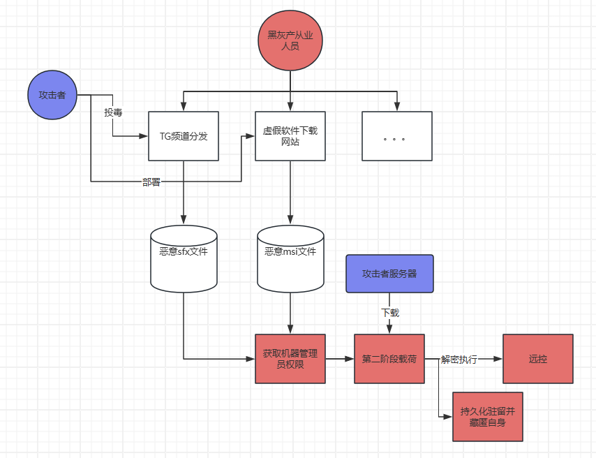 攻击最早自2023年8月开始,攻击者通过部署多个伪造软件下载页面来诱导访问者下载仿冒软件,同时以Telegram频道分发的方式进行投递恶意程序,最终实现远控。