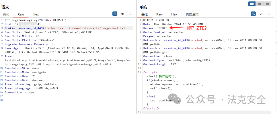HTTP/1.1 200 OKDate: Thu, 04 Jan 2024 10:44:22 GMTServer: TOPSECCache-Control: no-cachePragma: no-cacheSet-cookie: session_id_443=deleted; expires=Sat, 01 Jan 2011 00:00:00 GMT;path=/;Set-cookie: session_id_443=deleted; expires=Sat, 01 Jan 2011 00:00:00 GMT;path=/cgi/;Connection: closeContent-Type: text/html; charset=gb2312Content-Length: 122<script>alert('操作超时');if(window.opener){window.opener.top.location='/';self.close();}else{top.location='/';}</script>